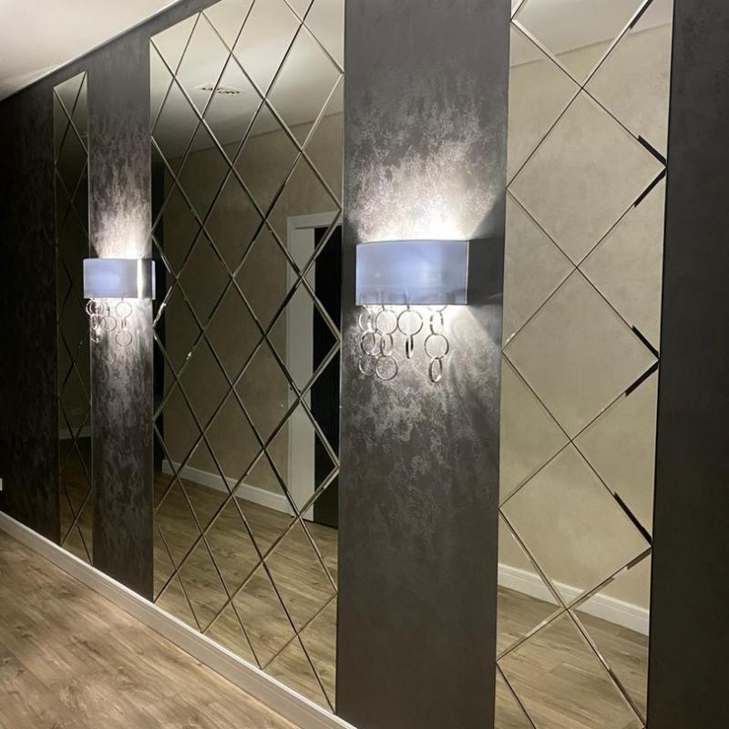 Использована серебристая квадратная зеркальная плитка размером 18х18.